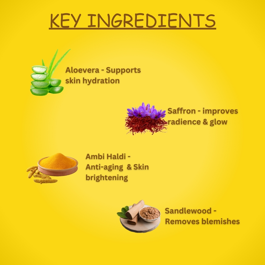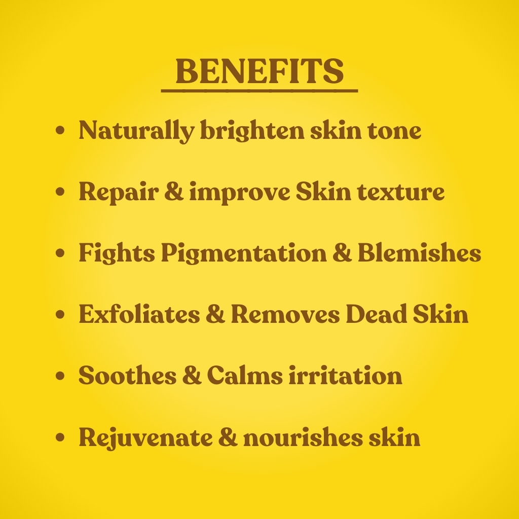 • Brightens Skin Tone: Turmeric helps to reduce dark spots and enhances natural radiance.